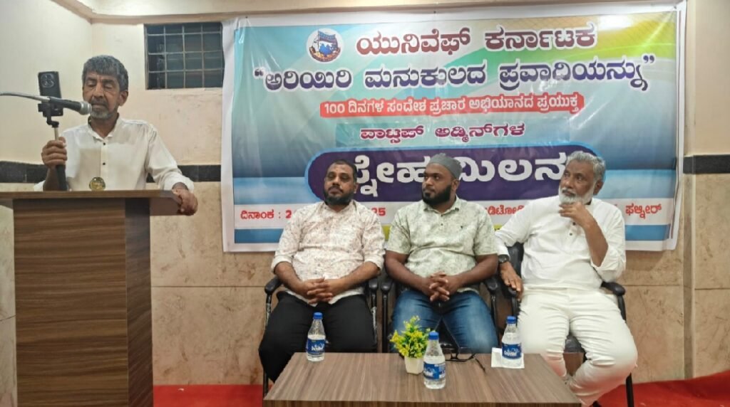 ಮಂಗಳೂರು:ಯುನಿವೆಫ್ ಕರ್ನಾಟಕ ವತಿಯಿಂದ ಇಪ್ಪತ್ತನೇ ವರ್ಷದ ‘ ಅರಿಯಿರಿ ಮನುಕುಲದ ಪ್ರವಾದಿ ಮುಹಮ್ಮದ್ ಸ.ಅ ‘ ರವರ ಸೀರತ್ ಪ್ರಚಾರ ಅಭಿಯಾನ ಕಾರ್ಯಕ್ರಮದ ಅಂಗವಾಗಿ ಇಂದು ಸಮಾಜಿಕ ಜಾಲ ತಾಣ ವಾಟ್ಸ್ ಆ್ಯಪ್ ಅಡ್ಮಿನ್ ಗಳ ಸ್ನೇಹ ಸಮ್ಮಿಲನ ಕಾರ್ಯಕ್ರಮ ನಡೆಯಿತು.ಮಂಗಳೂರಿನ ಫಲ್ನೀರ್ ಲುಲು ಸೆಂಟರ್ ಅಲ್ ವಹ್ದಾ ಆಡಿಟೋರಿಯಂ ನಲ್ಲಿ ಇಂದು ಸಂಜೆ 5.30 ಕ್ಕೆ ನಡೆದ ಕಾರ್ಯಕ್ರಮದಲ್ಲಿ ಸಂಸ್ತೆಯ ಮುಖ್ಯಸ್ಥರಾಗಿದ್ದ ಜ. ರಫೀಉದ್ಡೀನ್ ಕುದ್ರೋಳಿ ಅಧ್ಯಕ್ಷತೆ ವಹಿಸಿದ್ದರು.